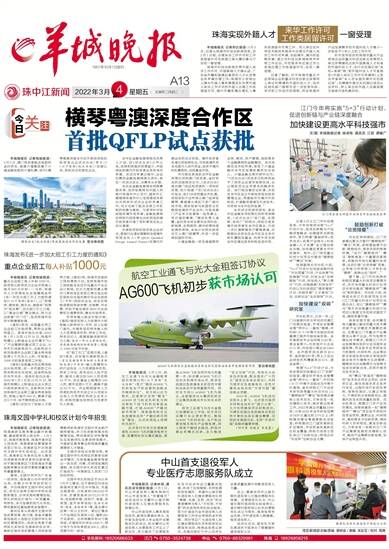 羊城晚报讯 3月3日,航空工业通飞与光大金融租赁股份有限公司(以下简称“光大金租”)签订“推动AG600飞机研发生产和运营的战略合作框架协议”。双方将以此为契机,加速探讨支持“鲲龙”AG60
