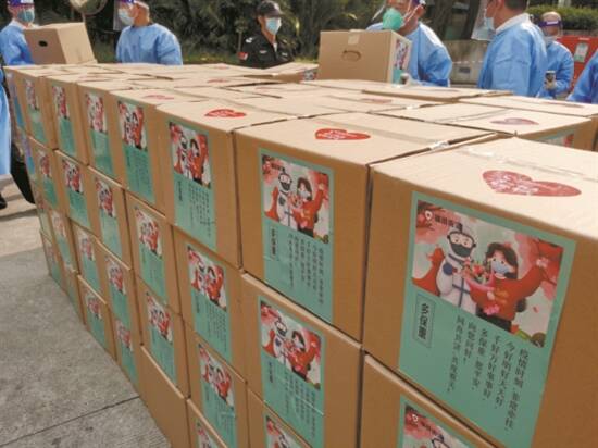 羊城晚报讯 记者李天军、通讯员林冰琦摄影报道:“感谢这么晚为我们服务的防疫工作人员和小区的志愿者,谢谢,你们辛苦了……”日前,福田区口岸社区封控区的居民,在收到街道免费派发的生活物资后,居民齐刷刷地在群里发出了这样的致谢语。 原来,自疫情发生以来,为做好封控区居民生活物资保障工作,福田街道开展了封控区“两天一送”生活物资保障关怀行动,隔离的居民陆续收到搭配过的“定制生活物资大礼包”,有蔬菜、水果、鸡蛋、猪肉、食用油……面对堆积成小山一样的生活物资,得知防疫一线工作人员和志愿者一趟趟地上下楼配送,深深感动了封控区的居民,收到生活物资的居民纷纷在居民微信群、朋友圈发图文晒出菜品,并对工作人员表示感谢。 据了解,根据疫情防控工作需要,福田区在福田街道划定封控区、管控区、防范区,福田街道第一时间成立生活物资保障组,保障封控区居民生活。封控区居民的生活物资保障,街道采取当天采购当天配送当天送达。为保障生活物资能以最快速度送达封控区居民手中,街道疫情防控指挥部合理设置各封控区的物资接收点,组建“专业配送公司+社区工作者+小区物业+封控区突击队”的“最后100米”关怀配送队伍。在物资抵达接收点后,便马不停蹄送往居民家中。确保食品肉类蔬菜新鲜送达居民手上。此外,疫情期间,福田街道专门设置了一个24小时全天候咨询热线,安排专职人员坐席,及时解决居民困难,各社区也同时开通了暖心服务热线,提供解决生活困难、心理疏导等服务,并积极帮助急需就医的居民联系医院。 福田区副区长兼福田街道党工委书记朱江表示:“在这场和病毒的赛跑中,组织辖区居民全员核酸检测之余,我们也要尽最大努力保障封控区居民生活需求,重点关注封控区居民特殊需求,全力保障好居民生命健康和日常生活。” 截至3月6日18时,福田街道为辖区6个社区10个封控区居民及时配送生活物资2909份,服务了1262户家庭,共3706名居民。接下来,福田街道将继续做好辖区封控区居民生活物资保障工作,积极为居民提供防护和生活物资,及时为有需要的居民提供心理援助和心理疏导等服务,同时,还将为封控区有需要的萌宠配送狗粮猫粮猫砂等生活物资。
