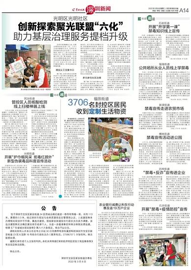 为进一步织密社区疫情防控防线,全力推进辖区禁毒宣传工作,3月2日上午,坪山区石井街道综合治理办公室工作人员走进辖区内的市场商铺、旅馆等场所,开展“禁毒+疫情防控”法治宣传。 工作人员向商户和