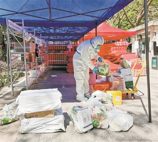 工作人员化身“大白”,准备为居民运送物资 |