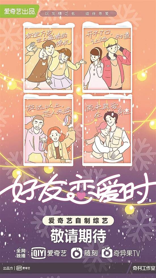 爱奇艺的新恋综《好友恋爱时》以“蓝颜/红颜知己”作为切入点,安排4对单身异性好友,共赴18天冬日假期,探寻两性间友谊与爱情的边界。