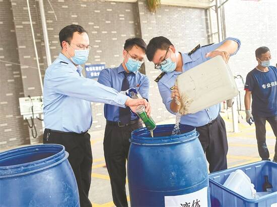 桂城市监所执法人员将假冒伪劣产品倒入桶里准备集中销毁 |