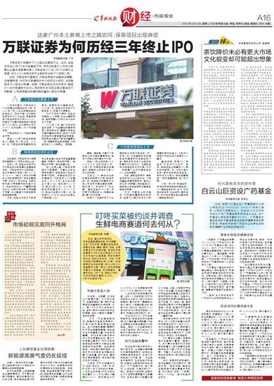 羊城晚报记者 丁玲 万联证券三年曲折IPO之路近日宣告终止。近日,证监会网站公布了《发行监管部沪市、深市主板首次公开发行股票企业基本信息情况表》,万联证券IPO在3月16日被终止审