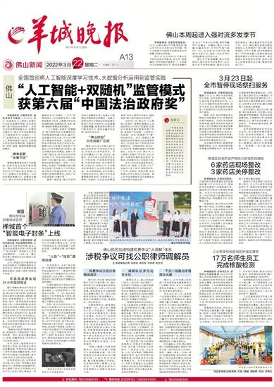 羊城晚报讯 记者梁正杰、通讯员郭子宁报道:3月20日,佛山“全国首创人工智能+双随机 开创法治监管新局面”项目荣获第六届“中国法治政府奖”。该项目实现监管效能最大化、监管成本最优化,佛山市市场监