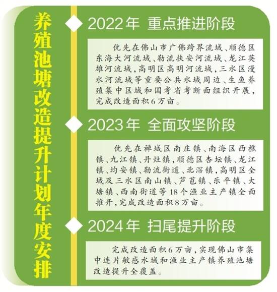羊城晚报记者 欧阳志强 通讯员 佛农宣 佛山渔业将迎来发展新动能。近日,《佛山市全域养殖池塘改造提升五年行动实施方案(2022—2026年)》(以下简称《方案》)印发,《方案》提出了四项重点任务,并对鱼塘改造行动按年度做出了具体部署,值得关注的是,《方案》指出,佛山市财政于各年度按照不高于改造成本25%的标准对实施主体进行补贴,今年将安排1亿元作为启动资金。 分类分步分片推进改造提升 《方案》明确,到2024年年底,完成省下达的20万亩养殖池塘改造提升任务,实现集中连片敏感水域和水产养殖主产镇养殖池塘改造提升全覆盖,建成8个以上省级示范性美丽渔场、2个以上国家级水产健康养殖和生态养殖示范区,绿色、健康、生态养殖模式覆盖率达65%以上,基本建成养殖池塘升级改造绿色发展示范市。到2026年年底,完成其他相对零散的养殖池塘改造,实现全域养殖池塘改造提升,水产养殖尾水排放问题得到技术性解决,渔业产业实现提质、增效、稳产、减排、绿色的高质量发展目标。 《方案》以重建岭南特色现代桑基鱼塘、实现养殖尾水资源化利用或达标排放为目标,分类推进、分步实施、分片指导全域养殖池塘改造提升,大力推行高质量零排放养殖模式,建设美丽渔场。 按照因地制宜、分类施策的原则,佛山除2023年度全市完成12万亩改造面积外,其余年度改造任务均为10万亩。因此,佛山市养殖池塘改造提升计划按年度划分进行,由各区于次年上半年完成验收。 四项重点任务推动渔业发展 《方案》中包含四项重点任务。 其一,佛山将实施全域养殖池塘改造提升。按照“池塘规整、深度适宜、灌排配套、设施先进、生态优美”的建设要求,结合实际选择标准生产型、简易生态型模式,开展清淤、挖深、塘形改造、固基、护坡以及道路、电力、进排水、投饵和增氧等设施规范化改造和养殖尾水处理设施建设。 其二,推广应用健康生态养殖模式。重点推广“三池两坝” 尾水处理模式、人工湿地尾水处理模式、池塘岸基一体化设备尾水处理模式、池塘“零排放”生态圈养模式等在本地实践过的健康养殖模式。 其三,推动渔业规模化生产经营。鼓励村集体将养殖池塘向专业大户、合作社等流转,引导将流转期限延长至十年以上。引导龙头企业采取“公司+农户”“公司+合作社+农户”等模式,集约50亩以上的连片养殖池塘开展规模化生产经营,实现土地、资金、技术、劳动力等生产要素的有效配置,提高产业化水平和竞争力。 最后,加强水产品质量安全监管。探索构建水产品质量安全长效监管机制,深入开展水产品“不安全、不上市”专项行动,全面落实属地责任、监管责任和生产经营者主体责任。指导养殖户科学控制养殖密度,实施“减药行动”,开展水产养殖投入品三年专项整治行动,试行水产养殖投入品使用白名单制度。 明确改造提升奖补标准 《方案》指出,全域养殖池塘改造提升实施对象为进行水产经济动物养殖以获得最大产出的生产型池塘,不包括环境美化、休闲垂钓、应急消防等非生产用途的池塘及水库。 《方案》还明确了全域养殖池塘改造提升奖补标准,即佛山市财政于各年度按照不高于改造成本25%的标准对实施主体进行补贴,其中2022年安排1亿元作为启动资金。市财政具体补贴标准按简易生态型不高于1000元/亩、标准生产型不高于2000元/亩(区级立项并向市农业农村局备案后,市级将按财政补贴标准的50%给予各区作为项目启动资金),其余部分由区镇两级和实施主体统筹解决。