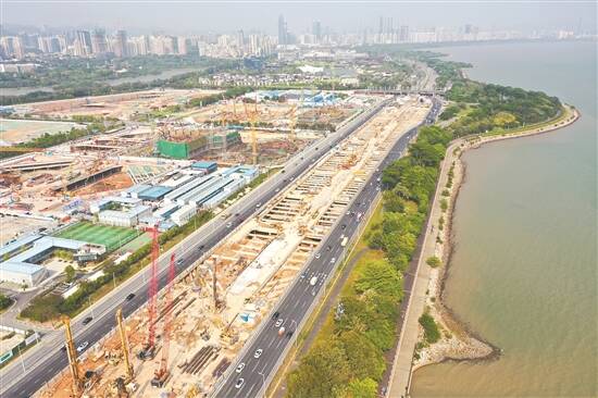 羊城晚报讯 记者王磊摄影报道:4月6日,记者在深圳滨海大道交通综合改造工程项目现场航拍看到,烈日下的工地一派繁忙。该项目是深圳市重点工程,目前正在加快开展主体结构深基坑开挖和道路改造。 据介绍,该项目地跨南山、福田两区,西起沙河东路立交,东至广深高速公路,改建长度5950米。建成后,地面可连接深圳湾公园,地下行车,将形成“地面+地下”立体交通,将极大完善城市干线路网,有效缓解超级总部段的交通瓶颈,同时消除滨海大道对深圳湾景观带的分割,促进城市建筑与滨海景观的融合,提供更高质量的公共空间。