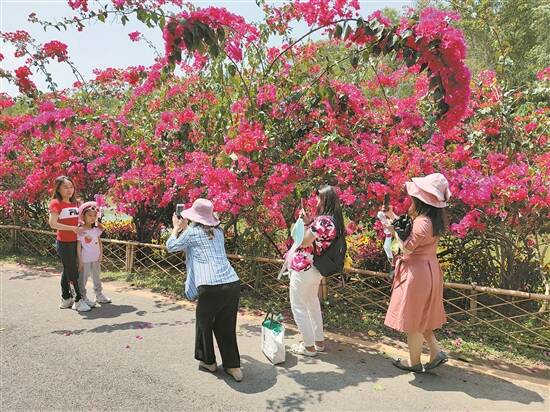 市民在盛开的簕杜鹃下留影 |