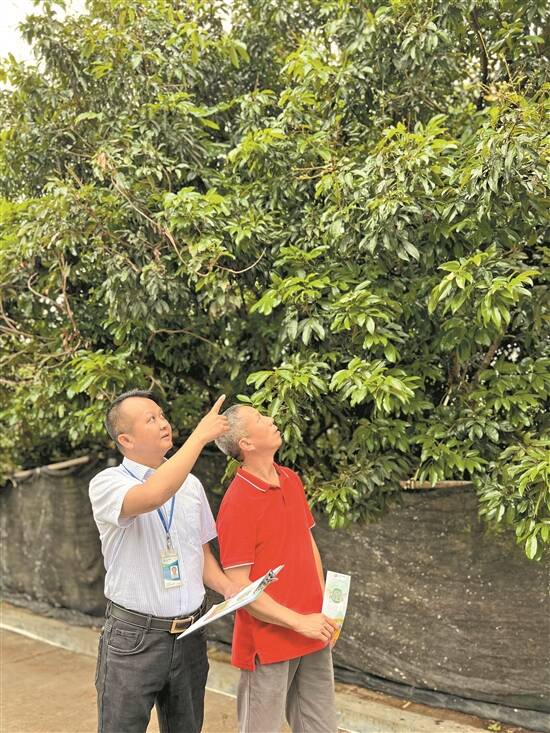 蔡远斌(左)在荔枝园走访荔农 受访者供图 |