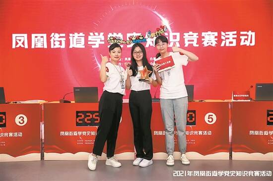 金文佳(左)和同事一起参加凤凰街道学党史知识竞赛活动并获得集体二等奖 |