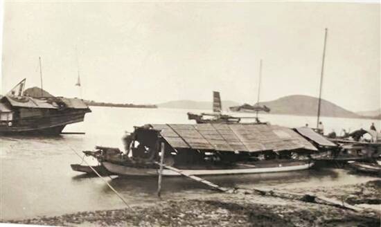 水东街沿东江一带的后街景象,众多船只停靠江岸码头,翻拍自《惠州近代历史图录》 李海婵 摄 |
