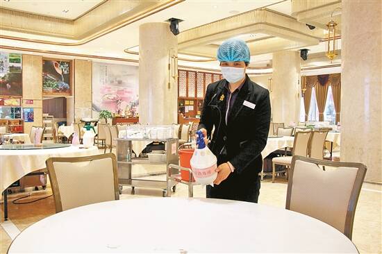 佛山一酒楼服务人员正在对餐桌进行消毒 |