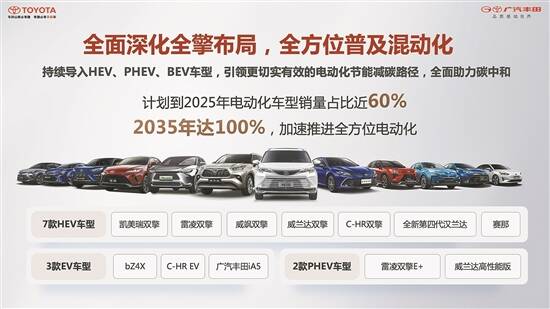 在车型结构方面,广汽丰田为市场提供了多元化的高价值产品。特别在混动市场,广汽丰田以HEV车型阵容强、结构优、销量好而领跑行业。得益于过硬的品质和良好的口碑,1-5月双擎混动销量达到117237辆,同比劲增122.7%,位居行业第一。其中,赛那双擎、汉兰达双擎、凯美瑞双擎、雷凌双擎均保持细分市场销量第一。未来,广汽丰田将持续提升混动比例,预计到2025年混动销量占比超过50%,累计销量突破230万辆。