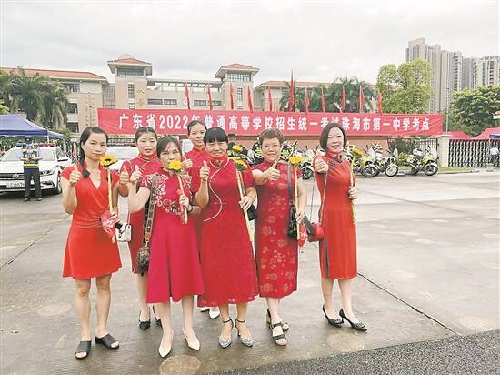 家长身着红色旗袍、手持向日葵为考生加油 |