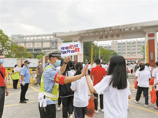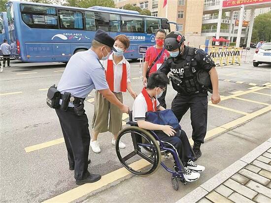 文/图 羊城晚报记者 陈卓栋 通讯员 江公宣 江交宣 谭耀广 7日,江门市29195名考生奔赴高考考场。公安机关“一考点一服务站”全程护航、教育局协同相关部门打造暖心服务网……相关部门各司其职,提供最暖心、贴心的服务,为高考保驾护航。 护航师生“赶考” 江门市公安局相关负责人表示,考试期间,全市公安机关按照“一考点一服务站”要求,在全市17个考点设立安保服务站,派出所、治安、户政、交警等警种部门派员进驻,现场受理、快速处置涉考报警求助。积极设立护考小分队,配备警用摩托车和应急车辆,加强通往考场主要路口和重点路段的巡逻,为有需要的考生提供应急服务。 而在高考首日,民警向不少遇到突发情况的师生伸出援手。 在鹤山一中考点,公安铁骑全程护送一名考生进入考点。据悉,该名考生因家庭特殊和身体抱恙等原因,此前无法搭乘大巴车队前往鹤山一中考点。为保证考生安全准时到达考场,鹤山公安主动与学校、家长联系,安排铁骑队员护送。6月7日早上6时30分许,民警提前到达和考生约定的地点,叮嘱考生要带齐身份证、准考证等考试用品,随后一路将其护送至鹤山考点入口。 而在江门一中高考考场服务站,值勤民警发现一名乘坐轮椅赴考的同学。经了解,该同学姓何。在他12年求学生涯中有一半时间受到疾病困扰,但他一直坚持上学,从未放弃。随后,民警安排特警将小何同学护送进入考场,并祝他旗开得胜。 接受民警帮助的还有监考老师。7日早上7时许,交警在江海区巡逻时发现,外海中学一位监考老师在赴考场途中发生事故,为了不耽误监考,协警杨权锋驾驶摩托车护送她进入考场。 考点配备心理治疗师 记者从江门市教育局获悉,今年高考江门市教育局协同相关部门,精心组织打造“十个一”“暖心高考”服务网,最大限度为考生提供“零距离”的暖心服务。其中,各高中学校在考前已组织对所有考生进行一次心理辅导,让考生放下心理负担,树立正确的考试观、成才观,放下包袱轻装上阵,用最好的状态考出好成绩。江门市卫生健康局还成立专门的心理危机干预组,向考点派驻固定的心理治疗师,为全市考生心理健康提供专业保障。 此外,因应新冠肺炎疫情防控需要,每个考点均配备防疫副主考、专业医护人员、核酸采样人员,备齐、配强卫生保障工作人员和医疗救护车,全市共安排医务人员115名,救护车24辆。 而江门市场监管部门也对辖区高考供餐学校食堂安排专人驻点监督,并安排应急队伍24小时备勤,确保考生用餐安全。