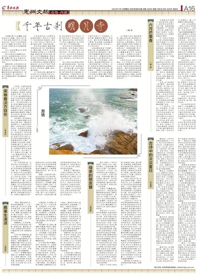 □胡 玲 石湾镇,惠州工业重镇,全国综合实力千强镇。很多人说,到了石湾,如果不游明月寺,则不算到过石湾。在这个工业为底色的现代化小镇里,明月寺是一抹古色古香、充满历史文化底蕴的鲜亮色彩。 近日,我来到慕名已久的罗浮古寺——明月寺。 明月寺地处石湾镇铁场村。古时候,这里梅林如海,花开似霞,香飘万里,故又名梅花村。关于梅花村,流传着许多动人的传说。 唐朝时期,文学家柳宗元在《龙城录》中,书写了隋朝赵师雄游罗浮山时,夜里梦见在梅花村遇见梅花仙子,和她月下对饮,醒来发现自己睡在梅花树下,原来只是南柯一梦,伤感不已。于是,“师雄醉卧梅花”的故事便流传开来。 北宋绍圣年间,大文豪苏东坡被贬至惠州,刚来不久,就写下了闻名遐迩的《咏梅诗》,其中有一名句“罗浮山下梅花村,玉雪为骨冰为魂”,写的正是这里。 明月寺坐北朝南,掩映在繁茂葱绿的大树之中,显得遗世独立,雄伟庄重。明月寺,多么富有诗意的名字啊,让人不禁浮想联翩,想起王维“明月松间照,清泉石上流”的清幽静谧,想起辛弃疾的“明月别枝惊鹊,清风半夜鸣蝉”的明净悠远,又想起李白“床前明月光,疑是地上霜”的意味深长,似乎关于“明月”的诗词都是恬静美好的,就如眼前这明月寺,寺如其名,清静、神秘,富有禅意。 大门前的石牌上雕刻着“罗浮初地”四个苍劲有力的大字。古代交通不便,游罗浮山要路经梅花村,会在明月寺休息或留宿,然后乘坐车马方可到达,于是,明月寺有了“罗浮初地”的美誉。漫长的岁月里,明月寺吸引了众多名人墨客到访,他们吟诗作对,留下了许多锦绣华章。 岁月的风尘没有掩埋明月寺的辉煌。明月寺建立于唐天宝三年(744年),距今已有1200多年历史。岁月变迁,罗浮山周边不乏一些古寺在风雨侵袭和战火动乱中湮灭,而明月寺保存完好,游客如云,位列罗浮五寺之一。 进入寺庙,但见里面古树参天,建筑群美轮美奂,“曲径通幽处,禅房花木深”的意境尽现,一种远离尘嚣、与世无争的感觉在心中油然而生。最前面,是气势恢宏的大雄宝殿,红石青砖砌成,大殿四周均为走廊。殿内,金碧辉煌,清香氤氲,一尊雪白的观音塑像端坐于莲花宝座之上,慈眉善目,不怒而威,静静俯视着天下芸芸众生。殿中四周布满壁画,画工精湛,笔法细腻,线条清晰流畅,画面色彩鲜艳,光彩照人,令人叹为观止。 大雄宝殿后面是“万佛楼”,楼高三层,仿宋朝建筑风格。朱红色的外观,雕梁画栋,门窗上均有古典精致的雕花作装饰,分外赏心悦目。顺着楼中的青石板台阶直上三楼,梅花村的山山水水、一草一木尽收眼底。站在走廊中,缕缕清风拂面而来,让人顿觉神清气爽、心旷神怡。突然,我闻到风中飘来缕缕清香,那香气清新淡雅,浓而不艳。循香望去,一棵棵巨大的龙眼树就伫立在楼前,花开正盛,嫩黄的小花仿佛点点繁星,静卧于青枝绿叶中,吸引了蜜蜂、蝴蝶前来采蜜偷香。 从万佛楼下来时,看到楼旁有一棵巨大的古树,树冠亭亭,叶片郁郁芊芊,呈心形。寺里的法师告诉我,这是菩提树。我不由想起六祖惠能大师的“菩提本无树,明镜亦非台,本来无一物,何处惹尘埃”。我虔诚地蹲下身子,从地上拾起一片菩提树的落叶,小心翼翼地捧在手中,如获至宝。我想,一定要把这片吸取了明月寺佛光灵气的菩提叶带回去保存起来。 从明月寺出来,我久久不愿离去。伫立于寺前,我心无旁骛,心底留香,带着朝拜之后的宁静与从容,耳畔突然传来寺院的阵阵钟声,一幅古老神秘的画卷便在脑海中生成,画里有四季如春的罗浮山,有悠闲古朴的梅花村,有风流倜傥的文人墨客,有惊艳脱俗的梅花仙子,还有肃穆悠远的明月寺……