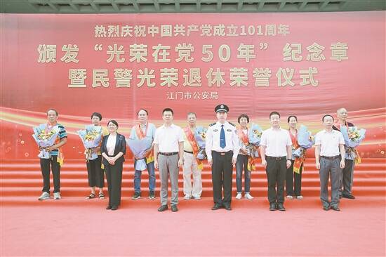 羊城晚报讯 记者彭纪宁、实习生钟银佩,通讯员谭耀广、曹晶摄影报道:为热烈庆祝中国共产党成立101周年,全面贯彻新时代党的建警治警方针,进一步增强公安民警辅警的职业荣誉感、自豪感和归属感,6月30日上午,江门市公安局举办庆祝“七一”升国旗、颁发“光荣在党50年”纪念章、民警荣休、表彰奖励等系列活动。 上午9时,升旗仪式在江门市公安局机关大院广场举行。随后举行颁发“光荣在党50年”纪念章暨民警光荣退休荣誉仪式。江门市副市长、市公安局党委书记、局长冯小钢,江门市委组织部常务副部长宋岩,江门市委宣传部副部长高钢华,江门市委政法委二级调研员曾纪宏,江门市直机关工委四级调研员屠阿丹参加活动并为代表颁发纪念章。7名老党员和11名光荣退休民警代表分别获得“光荣在党50年”纪念章和“荣休纪念章”,新警代表向“光荣在党50年”的老党员以及离退休老民警献花以表达敬意。 随后,在该局多功能会议室隆重举行了江门公安表彰奖励暨“邑警先锋榜”发布仪式,一批立功受奖代表及表现突出的集体和个人获得表彰。会上还首次发布了“邑警先锋榜”,该榜根据工作和业务类型设置“邑警铁拳”“特战标兵”“法制能手”“技术精兵”“交通卫士”“监所模范”“服务使者”“文秘军师”“管理之星”“抗疫先锋”10个类型,198人入选第一批“邑警先锋榜”。 冯小钢指出,去年以来,在江门市委、市政府和上级公安机关的坚强领导下,全市公安机关紧扣经济社会发展大局,聚焦主责主业,全力做好防风险、保安全、护稳定等各项工作,实现了“四升四降”和“五个不发生”目标。今年以来,全市公安机关以党的二十大安保维稳工作为主线,认真落实市委党建引领基层治理,扎实推进“邑安2022”行动、“五大要素”摸排管控、重点镇街整治、打击整治养老诈骗等系列专项工作,圆满完成了全国两会、清明、五一、省党代会、高考等维稳安保和创文迎检等工作,成功破获了一系列大案、要案、积案,全市刑事治安警情同比下降21.1%,有力维护了江门市政治大局和社会治安大局持续平稳。 据了解,“七一”期间江门市公安局还将组织党员重温入党誓词、过政治生日、红色观影、慰问老党员和困难党员、趣味运动会等一系列丰富多彩的纪念活动。