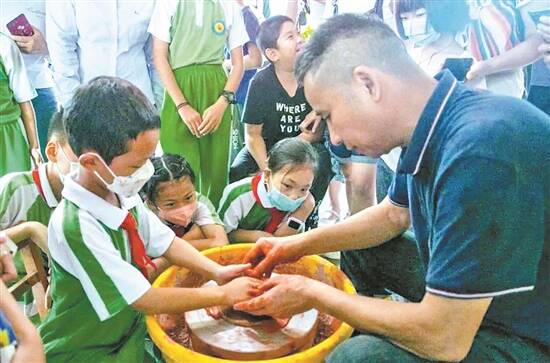 苏洛其向小学生传授陶艺技法 欧蕊荣 摄 |