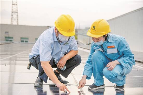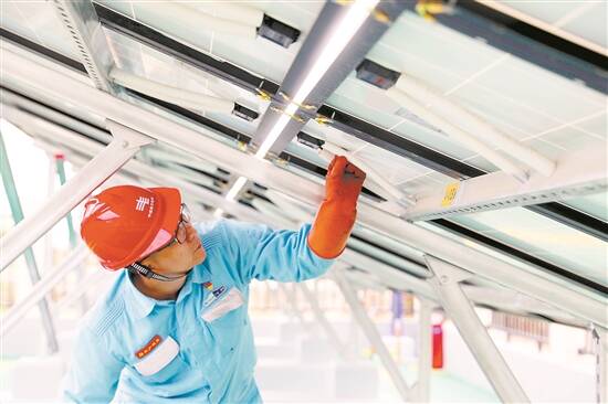 江门台山供电局端芬供电所工作人员正在端芬桂花围台区微网工程内检查光伏板 郑茵茵 摄 |