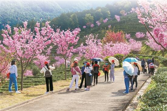 □叶光海 阴那山景区位于梅县雁洋镇境内,距离梅城约30公里。这里群山环抱,苍翠连绵,云蒸霞蔚,樱花漫山红遍,娇艳含笑。满园春色关不住,游人阵阵,走进仙境般境界,顿感神清气爽,心旷神怡。 曾经有人说:错过了阴那山的樱花,就是错过了梅州最美的春天。 又是阳春三月,阴那山的樱花竞相绽放,樱花园在漫山遍野的茶田中肆意拓展、延伸,如流似海,尽显春光浪漫,诗意无边。有诗云: 春回大地野芳发,阴那樱花映朝霞。 山岭新装披翠绿,嫣红旖旎醉仙家。 古往今来,文人墨客皆以诗词歌赋津津乐道花事,其花开留香的品质被世人赞誉。诗人邓尔雅言赞:“昨日雪如花,今日花如雪。”来到阴那山花海,漫步樱花林间,置身于仙境之中,似觉欣欣然、飘飘然。春风里,温暖的阳光,透过林间斑斑驳驳,洒满林道,温暖心窝。微风徐来,缕缕花香醉人心扉。春光和煦,景色迷人,如诗如画。阴那山樱花园,好一个“世外桃源”! 樱花飞舞如雪天,斜风细雨不须归。似有若无香缥缈,诗情画意天地间。樱花淡淡的殷红,粉嫩的花朵与山水相融,没有灼灼其华的艳丽,但美得自然,美得质朴。老舍先生在《奈良三笠山》写道:“乡情莫问天边月,自有樱花胜洛阳。”如果你是游子,满树压枝锦簇的樱花定会让你坦然释怀。 作家郁华赞美樱花诗曰:“万家井灶绿杨烟,樱笋初开四月天。十里隅田川上路,春风细雨看花船。”看啊,樱花在飘落时犹如仙女散花,漫天飞舞,飘飘洒洒,有一份独自浑然成趣的诗意。樱花,樱你而美,美在脸上,美在心里,美得让人陶醉。在这樱花世界里,如果樱花美而不自知,那么旁边的溪流、潭水便是她的自然镜面。 唐代元稹《折枝花赠行》写道:“樱花树下送君时,一寸春心逐折枝。别后相思最多处,千珠万珠绕林垂。”而这阴那山的樱花无限浪漫,年轻人来到这里,便是一场春心萌动的樱花盛宴。花海犹如一幅天然画卷,这里花香四溢;花海下面是人海,姑娘们换上了春装,似乎在比看谁最美丽,最动人,一个个如仙女般降临到这个人间仙境。年轻人成双成对,进入花丛中拍照留影,相依相伴,卿卿我我。清新的春风掠过花丛拂在人的脸上,这爱情的旋律拨动恋人的心田,诉衷肠,话心语,缠绵、甜蜜,恋恋不舍。难怪乎,李商隐说:“樱花烂漫几多时?柳绿桃红两未知。” 春季的微风,温柔地将人们唤醒。和煦的阳光洒在樱花瓣上,正是春日最应记录下的美好时刻。目之所及的樱花是抬手可及的胜景,游人的笑靥和美景融为一体,更是尽情绽放的美丽花朵。“待到山花烂漫时,她在丛中笑。”让心中的愉悦舒展出灿烂的笑容,让三月的暖阳倾洒娇美的芳菲,让春日最美的风景谱写成春天的舞曲。 此时,晨雾已经散去,你看到盛开的樱花,照亮溪边沉默的村庄,香气蔓延不息。你伫身于花下,现出瞳仁里深邃的存在,闪亮的内涵,拂起三月的微风,带着满怀的喜悦。这一刻,你在完整的春天里。 阴那山,“樱”你而醉美。阴那山樱花园,一场浪漫的樱花盛宴。