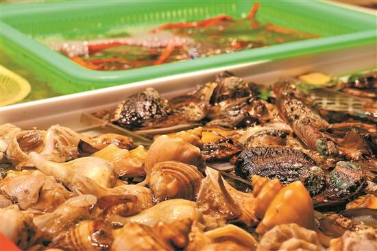 贝类海鲜在灯光下颇为诱人 |