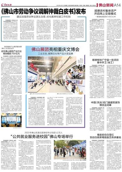 羊城晚报讯 记者吴泳、通讯员徐振珂报道:日前,佛山市人力资源和社会保障局正式发布《佛山市劳动争议调解仲裁白皮书(2018-2022)》(以下简称“白皮书”),该白皮书全面展现佛山市近五年在构建和谐