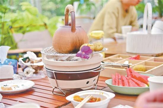 羊城晚报记者 梁正杰 来到旺林艺术花园的花园餐厅里,10多围围炉煮茶错落有致地分布在花草树木、园林小院中。木桌上,陶制茶壶嘟嘟冒着热气,10多个茶客沿桌围坐,一边喝茶聊天,一边品尝茶点水果。充满花园景致与中式茶文化气息的茶摊布局,加上古朴茶具,庭院里盛放的春花,颇有一番“红泥围炉”的中式意境。 旺林艺术花园副总经理练继雄表示,当初刚推出这个项目的时候,的确没想到会那么火爆。相对于普通餐厅、茶楼,景区的花园布局、庭园设计……更有优势,组合成了一个中式花园的围炉煮茶空间与环境。 “一句‘闲来松间坐,看煮松上雪’诗句,说尽了冬日围炉夜话的闲情雅致。”旺林艺术花园创建人钟海旺对记者说,在中国的传统茶文化中,最早的“围炉煮茶”被称为茶宴,兴起于南北朝,在唐宋时期尤为盛行。古人煮茶前先把茶叶碾成碎末,制成茶团,饮用时把茶捣碎,加入葱、姜、枣、薄荷、橘子皮和盐等调料一起煎煮。 围炉煮茶为何突然火了,这缘于休闲经济的崛起。打工人渴望从当下充斥“焦虑”“内卷”的生活中抽出片刻时光,让大脑、身心得以放空。因而,“围炉煮茶”的背后是打工人想摆脱“奔忙”生活的仪式感,也是对慢生活的向往。