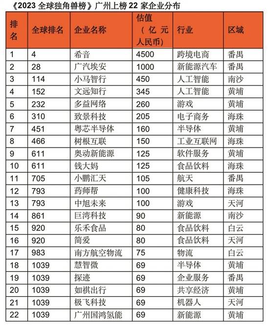 近日,胡润研究院发布《2023年全球独角兽榜》,将成立于2000年之后、估值10亿美元以上的非上市公司定义为“独角兽”。根据榜单,广州是过去一年独角兽数量增长最快的中国城市,一年净增12家独角兽企业,数量达到了22家,与杭州并列国内第四。