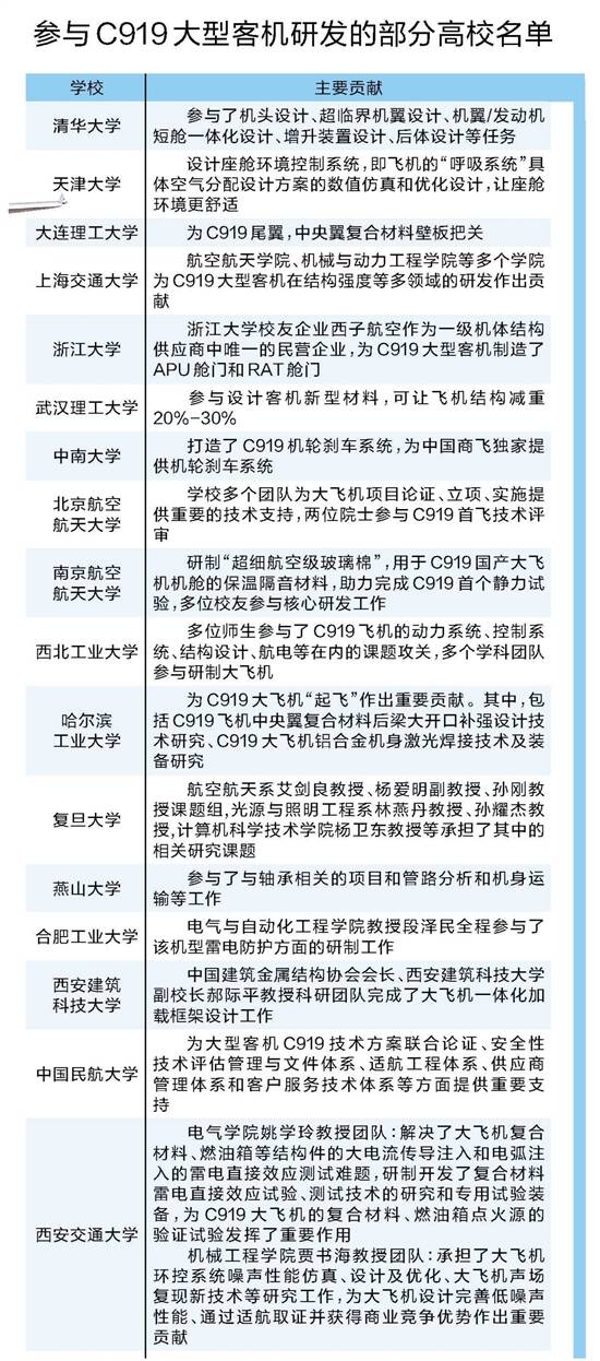 文/表 羊城晚报记者 孙唯 实习生 邹茉 5月28日,自上海虹桥国际机场起飞的东航MU9191航班平安降落在北京首都国际机场,标志着国产大飞机C919圆满完成首个商业航班飞行。C919首飞成功,标志着中国自主创新能力的扶摇直上,同时也意味着中国民航不再全部依赖国外进口,真正走出了一条自主发展之路。 自2008年以来,C919潜心沉淀了15年。回顾C919飞机的研制过程,它承载了我国数十万名航天人的蓝天梦。除了国内顶尖的航天科研人员之外,包括清华大学、北京航空航天大学、西北工业大学、南京航空航天大学、上海交通大学、哈尔滨工业大学等多所高校在内的师生也为C919的研发作出了突出贡献。 例如,“举全校之力,全力支持C919!”成了当时西北工业大学在校流传的口号。2008年联合工程队总结大会上,时任常驻上海工作组组长的西工大航空学院李栋教授总结说,作为项目启动的标志性事件之一、“联合工程队”的建立和半年的运行意义重大。 同在2008年,南京航空航天大学遴选29名骨干教师加入中国商飞大型客机联合工程队,其中有18名教师集中半年时间在上海参加方案论证工作。南航在C919研制阶段,参与近150项科研项目,取得了近二十项重要科研成果,为商飞C919的研制提供重要技术支撑。 中国高校能在本次国产飞机的研发过程中作出突出贡献,离不开各高校多年来对航空航天人才的悉心培养。 多年来,南京航空航天大学勇担“航空报国”使命,为中国商飞输送了大量优秀的航天人才。其中,包括C919总设计师吴光辉、中国商飞公司制造总师姜丽萍等杰出代表。 吴光辉在南京航空航天大学建校70周年发展大会的致辞中表示:“回忆起在南航求学的经历,我仍然记得在机库里上飞机设计课的场景。同学们围坐在飞机旁边,老师现场讲解结构设计,极大程度地促进了我们实践能力的提升,让我至今仍受益匪浅。” 同样的,北京航空航天大学也竭尽全力做好了人才培养。北航成立了大型飞机高级人才培训班,旨在培养大飞机关键领域的紧缺人才。该校坚持“三能力,四素质”的培养理念,至今已培养大飞机行业工程师1000余人,为我国大飞机的研发提供了技术支持。 每一次起飞都承载着航天强国的梦想,每一步跨越都刻下中国航天人的追求和信仰。追逐蓝天梦的路上,未来会有越来越多的航天学子同行,“我觉得学生们当下应当学好课本知识,再将理论运用到实践中。”吴光辉说。