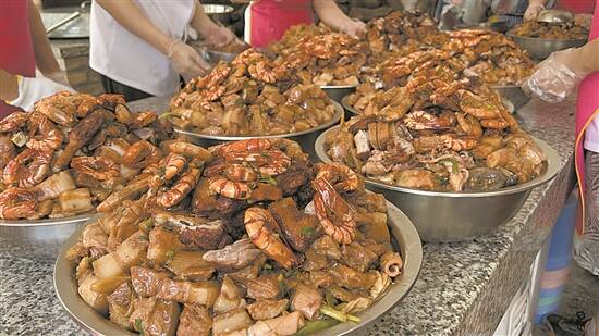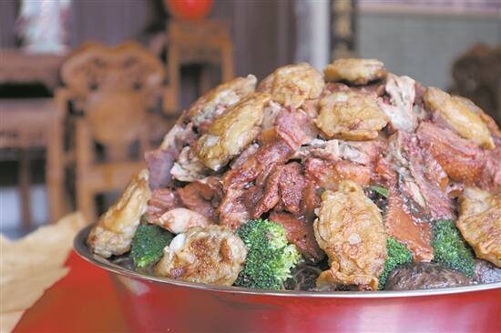 文/羊城晚报记者 王俊 图/羊城晚报记者 李艺戈 同属岭南的深港两地,文化同根同源。在文化传承上,深港两地有着许多相似相通之处。荟萃百菜百味的大盆菜,就是深港两地同根同源在饮食文化上的印证。如今,大盆菜仍在香港新界元朗、深圳大鹏半岛、深圳福田下沙等地传承。 延续:率先恢复大盆菜习俗 这种一桌一盆的杂烩菜式起源于南宋末年,南宋残军簇拥宋少帝赵昺沿海道一路南逃,来到深圳湾一带,驻跸香港新界的二王村(现名宋王台),当地百姓纷纷拿出各种食物一齐倒进一口军用的大锅中,暂且供宋军充饥。后来,每逢喜庆节日,例如新居入伙、祠堂开光或新年点灯等,当地乡村就会举行盆菜宴。再往后,大盆菜历经八百年历史而不衰,成为广东深圳和香港新界一带的重大民间习俗,以丰厚的文化内涵,串联起深港饮食文化的亲密情感。 值得一提的是,在深圳地区,福田区下沙村可谓将大盆菜做工、配料、烹饪等风俗方式保存得最为完好,很好地沿袭了盆菜的各种历史讲究。1993年元宵节,大盆菜习俗率先在福田区下沙村恢复。之后,深圳其他村相继开展,且规模逐年扩大。2002年,下沙村举办的“深圳市福田沙头下沙黄氏宗亲会元宵节民间艺术系列活动”举办席数、参加人数之多,均被载入吉尼斯纪录,获得“世界吉尼斯之最”,在海内外产生了重大影响。大盆菜,这种古老的文化习俗在深圳湾得以继续传承和发展。 传承:吃盆菜被赋予国际特征 “大盆菜宴的形成和传承,跟这一地区人口的来源和构成情况有紧密联系。”深圳市沙头下沙实业股份有限公司董事长黄杰文介绍,历史上的深圳地区原本是一个移民地区,其先民多为宋、元时期从中原迁移而来,黄氏家族也是在这一时期迁入下沙。这些外来人口往往是一个家族聚居在一起形成一个村落,“全村一姓、全族一姓”为大盆菜的形成和传承提供了便利条件,形成了其特有的文化特征。 黄杰文介绍,福田下沙村村民以黄姓为主,其先祖可追溯至晚唐的黄峭山(后人尊其为“峭山公”)。南宋中晚期,一支从江西迁徙而来的黄氏族人来到下沙,黄峭山第十四世孙黄默堂就在这一片滩涂之上开基立村,从此将深圳作为新的故乡。下沙黄氏先人成为最早落户南粤深圳的开拓者。据介绍,下沙黄氏后裔目前分布于美国、加拿大、墨西哥、柬埔寨、越南、马来西亚、 新加坡、印尼、菲律宾、泰国及台、港、澳等10多个国家与地区。 “由于大盆菜习俗与祭祖等人生礼俗结合在一起,海外黄氏后裔元宵节回国祭祖、探亲,都要参与大盆菜宴。流行于深圳湾地区的大盆菜宴习俗又被赋予了国际特征。吃盆菜成了下沙村居民、港澳同胞、海外乡亲齐聚一堂、共同庆祝传统节日的特殊形式。”黄杰文说。 纽带:“留住乡愁”共聚同胞情 据介绍,福田下沙村的大盆菜宴举办时间一般是在每年元宵节,举办地点在下沙祠堂门外的广场上。开宴前,要先放鞭炮,并在广场上舞龙舞狮。下沙村有自备的龙和狮,龙长108米,要上百人才能舞动。龙头是用竹子扎制,外面糊上彩色油纸,龙身用红布、兔毛做成,龙须以鱼丝为材料。狮头也是用竹子和彩纸做成,狮身是用棉布制成。下沙村的龙狮队由下沙村民和原籍下沙、现居香港的黄氏后裔共同组成。 宴会前,客人陆续进场,龙狮则在祠堂外的广场上四处游动,迎接客人,烘托欢乐的气氛。等客人到齐,立即鞭炮齐鸣,鼓乐喧天,龙狮齐舞。广场上人头攒动,热闹非凡,男女老幼一齐涌向广场,犹如“百鸟归巢”。龙狮舞毕,一盆盆大盆菜摆上桌子,成千上万人同时开宴,场面十分壮观。 2009年,下沙大盆菜被选入广东省非物质文化遗产,成为寻根问祖、联络感情、携手走向新时代的“连心菜”。2016年11月13日,世界黄氏宗亲总会第十二届第三次恳亲大会于下沙文化广场开幕。来自“一带一路”的海外访亲同胞、来深建设者和社区乡亲上万人共尝大盆菜,共聚同胞情。交流活动以黄氏姓氏文化为桥梁纽带,构建了海内外中华儿女寻根问祖的平台和载体,凝聚力量,促进国内外经济、文化交流。 发展:亲情作桥促进经贸交流 “文化搭台,亲情作桥,交流经贸文化,恳亲交流活动助力福田加快建成一流国际化中心城区和率先落实‘四个全面’的首善之区。”黄杰文说,下沙大盆菜是源远流长的文化根脉,也是一份难以割舍的中华情缘。以大盆菜为纽带,下沙将勇担新使命,树立新标杆,坚持高端化导向,拓展高标准空间,营造高品质环境,全面融入中心区一体化发展,全面提升环境质量和文化内涵,努力打造深圳“最美风情社区”,成为国际化湾区名城的闪亮明珠。 “留住乡愁,留住我们的记忆,增强文化自信,大盆菜作为深圳一张闪耀的文化名片,很有魅力,也有生命力,值得被好好保护。”黄杰文表示,今后,下沙将充分发掘利用大盆菜、黄氏祭祖文化、宗亲祠堂等文化资源,大力发展乡村生态旅游。游滨海公园、吃大盆菜、看下沙博物馆、住下沙酒店,成为都市乡村游的新模式。同时,以大盆菜宴为纽带,架起“一带一路”交流的大舞台,让海外同胞和华商外商通过这一窗口,体验深圳市福田中心区一流的人文环境和投资环境。