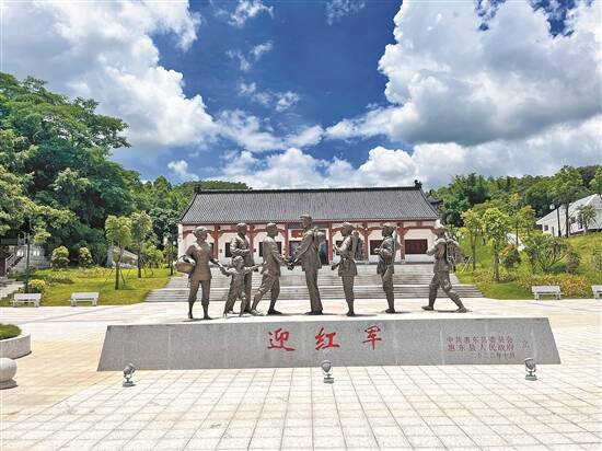 栩栩如生的雕塑描绘着雁湖村村民携妻带儿迎红军的场景 |