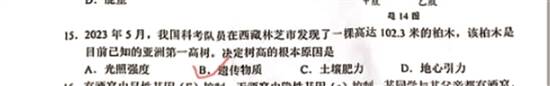 来自河源市的郑宇豪同学表示,这两道生物题他很快就做出来了,“石斑鱼是鱼,鱼是用鳃呼吸的,当时毫不犹豫就填了‘鳃’;而决定树的高度肯定是遗传因素,所以我选了B.遗传物质”。让郑宇豪不解的是,考完以后,这两道题目在班级群内引起热烈讨论。“有同学把抖音上一条所谓正确答案发到群里,说石斑鱼是哺乳动物,用肺呼吸;而植物向上生长的决定性因素是地心引力。”