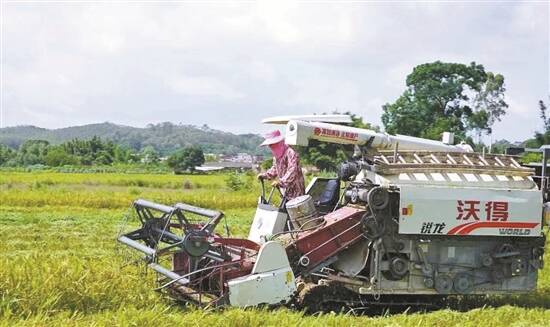 羊城晚报记者 陈卓栋 通讯员 江讯 谭耀广 记者13日从江门市农业农村局及各地农业农村部门获悉,作为粤港澳大湾区重要“米袋子”,江门今年夏粮收割进行得如火如荼。据悉,今年江门市早造播种面积为8.346万公顷,预计7月中下旬即可完成全部收割工作,产量将与去年持平。 农机收粮一气呵成 据了解,目前江门水稻种植机收率已达98%。农机成为夏粮收割的“主力军”。 位于江门市新会区双水镇木江村的文发农场,租借了4台最新的联合收割机。从6月29日开始,不到十天的时间,在完成该农场自种的约34.7公顷水稻的收割工作的同时,还为周边约133.3公顷水稻提供了社会化服务。文发农场负责人张永发表示:“两台新型联合收割机两个小时可以收割9吨水稻,在以往,靠人力收割要整整一天时间。” 在恩平市沙湖镇,相关人士介绍,一部收割机一天能收割2.6公顷左右的稻谷,效率相比传统人工割稻大大提升。在江门台山市冲蒌镇,得益于收割机马力全开,收割、碎秆一气呵成,近3万亩水稻在7月上旬已完成收割……侨乡处处稻田金黄,农机成了“抢手货”。在江门鹤山市,当地拥有注册登记收割机67台。今年当地早稻种植面积约4927公顷,由于生长期间光温充足,水稻成熟期比往年提前一周左右。当地相关负责人表示,有关部门和各镇(街)及时做好农机具调配和指导服务工作,争取成熟一块就收割一块。 南方田里长出北方米 记者注意到,今年的夏粮收割中,不少农企深耕江门良田,成果初现。 在江门市新会区三江镇沙仔岛,江门市丰和农业发展有限公司承包了沙仔岛约86.67公顷水稻田,种植品种主要有象牙香、19香等。该公司管理人员翁英杰介绍,结合沙仔岛垦复水田的特征,他们探索水稻收割新方式,包括使用大型收割机收割,收割后对耕种区域进行整地、开沟扫水、防虫防病、有效施肥等,同时积极利用稻田空间,将水稻种植与水产养殖、农艺与农机有机结合,开展“稻—渔”“稻—鸭”等综合种养模式实践,通过对稻田实施简易工程化改造,水稻种植和水产养殖协调共生,达到以渔养田、以稻养水和以渔促稻的目的。目前,该区域耕地年产稻谷1000多吨,这里不仅每年水稻丰收,稻田之间还有鱼、鸭、大闸蟹、禾虫等其他农产品产出。 而在台山市都斛镇“广东第一田”里,今年夏天,南方田长出了北方米。记者了解到,今年3月,台山市都斛镇政府与北大荒集团庆丰农场有限公司签署合作协议,依托“广东第一田”资源禀赋,打造33.3公顷高标准农业示范田,实施“北技南移”试验,种植4个北方水稻品种。“我们在试验田使用北方常用的水稻宽窄行栽培技术,利用作物边际优势和高光效应增产原理,将水稻插秧行距设置为宽行与窄行间隔栽培,提高水稻光能利用率,加强通风,降低稻田有害生物影响,同时利于机械作业,找出江门丝苗米的最佳插秧密度。” 北大荒集团庆丰农场台山农服中心负责人王晓东表示,新技术比普通插秧机30厘米的行距能增加10厘米的密度,每平方米增加了三四穴道水稻穴数,产量明显提升,增加5%到10%,亩产基本在900斤左右。“通过第一造种植观察,北方的品种在南方种植、宽窄行种植、侧身施肥技术和扶直导航等新农机应用总体来说效果非常好,我们将在下一步秋种中进一步扩大新农机推广应用力度,将智慧农业逐步形成规模。”