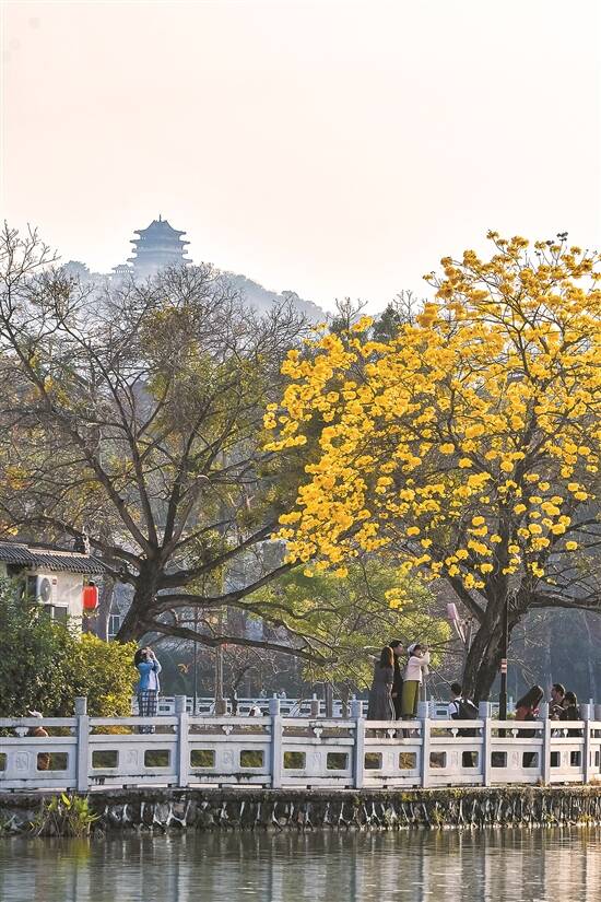 大街小巷的黄花风铃木盛开,吸引人们观赏 吴伟荣 摄 |