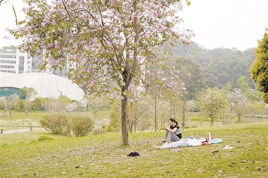 羊城晚报讯 记者石梦卓摄影报道:木棉花、紫荆花、樱花、黄花风铃木……在东莞的公园里,在马路旁、河畔边,各色花朵争相绽放,装点着大街小巷,整座城市弥漫着春天的浪漫气息。 在位于东城的香遇走廊,数百棵粉白紫荆花灿烂绽放,美如粉黛,散发着淡淡幽香。不少市民朋友铺上野餐垫,在绿地上与家人朋友共享休闲时光,也有不少市民带着孩子来亲近大自然,让他们在绿意盎然的草坪肆意奔跑。 春回大地,红艳艳的木棉花也开满枝头,热烈而奔放。在龙湾湿地乐跑公园,火红灿烂的木棉花掉落一地,碧绿的草地衬托着木棉花的鲜艳,让人赏心悦目。来自高埗一间小学的英语老师,特地选了这处美景,带着学生们来拍摄参加口语大赛的视频。“这里的木棉花开得旺盛,刚好趁着中午阳光明媚,带着孩子们来这里拍摄。” 此外,还有黄牛埔森林公园的向日葵花海、东莞植物园的三角梅、东莞中心公园的郁金香、石排镇海仔湖公园的樱花……一派春日繁花景象,为东莞增添了无限生机。