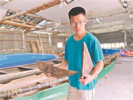 文/图 羊城晚报记者 曾柯权 赵映光 端午节将至,汕头市澄海区遍布城乡各地的江河池涌再度热闹了起来,众多村落端午节的龙舟训练“备战”正在紧锣密鼓地进行着。而昌利造船厂的当家人、今年24岁的吕铭也迎来了一年中最繁忙的时刻,除了要赶工交付新制作完成的龙舟外,还要承接许多来自潮州官塘、澄海各地的龙舟打磨翻新任务。 位于汕头澄海区莲华镇南美村的昌利造船厂,是当地远近闻名的“龙舟世家”。据吕铭介绍,澄海周边地区端午节龙舟竞渡时使用的“无头臼”龙舟,大约有九成来自于他家的造船厂。“吕氏家族造龙舟至今已有400多年历史,按照排序我已是第二十代传承人。‘昌利’的字号就是吕家祖先所创的,我们正在努力将世代相传的传统龙舟制作技艺申报为非遗项目。” 作为一名“00后”,吕铭从父亲手中接过祖传的造船工具不过短短的两年时间,他将如何肩负起20代人的匠心沉淀、续写龙舟“船”人的新故事呢? 用祖传“梁头模”打造“标准化”龙舟 日前,羊城晚报记者走进昌利造船厂采访时看到,这间略显简陋的工厂中间最显眼的位置,架着五六条龙舟,它们中有刚刚新制完成的,也有从潮州官塘以及周边各地运来刷油漆、打磨翻新的,船厂内空气中散发着淡淡的杉木和桐油的味道。 见记者到访,吕铭停下来手中不停转动的弓钻,从一处角落拿出许多不常见的造船工具,自豪地向记者介绍起吕氏家族造龙舟的“威水史”。按照吕铭的说法,吕家造船的历史,大约可以追溯到距今已有400多年的明朝年间,而“昌利”字号也大约已有一百年的历史了,“此前我在隆都镇的一座祠堂内,就找到了一条有近百年历史的昌利号龙舟,我认为这就是很好的历史证明了。”吕铭说。 “我们吕家原来有昌利、昌盛、吉利以及吉盛四个字号,造龙舟技艺也都是世代相传的,现在就只剩下我们昌利一家了。”吕铭说,由于没有族谱和相关文字资料记载,他们的家族传承都是传帮带和口耳相传,“我叔公在临终前说这门技艺传到我爸已经是第19代了,他的遗愿是我爸要继续将它传承下去,现在这个使命也由我爸传到了我身上。” 据吕铭介绍,当地流行的龙舟多数是“斗船”,没有栩栩如生的“龙头”“龙尾”,也没有载员众多、长度夸张的龙身,而是两头平平、中间凹下、状若织梭的“无头臼”,整个船底由7片木板组成,船长8.6米、宽1.2米,“这样的船只轻巧灵活,在狭窄的水域中也可来去自如,更加适用于在潮汕地区的河道进行直线竞速和绕圈相互追逐两种形式的竞赛,拐弯时堪称‘水上漂移’。” 然而,此类龙舟看似简单,制作时却也颇费心力,需经过选材、晾晒、量尺寸、开船板、刨木精修、标钉孔、钻钉孔、拼装船体、架龙骨、编柿花、上油漆等十多道工序,整个过程几乎全是用墨斗、刻刀、弓钻等祖传造船工具纯手工打造完成,“制作整艘船大概要25天,一艘龙舟就要打1500个左右的船钉。”吕铭说。 在吕铭展示的众多造船工具中,最具特色的当属吕氏家族传承了上百年的“梁头模”,这套被使用到已经包浆了的模具使得吕氏的龙舟可以实现标准化生产。可以说,除了有近百年历史的老龙舟外,吕铭手中的祖传造船工具,也见证了这个“龙舟世家”的历史。 采访过程中,吕铭还专门向记者展示了这套“法宝”的使用方法——将这些梁架模板按间隔船梁的顺序,垂直放到龙舟的船底中心线上,梁架模板特有的弧度,就是船底的弧度。“有了这个参数,就能省去测量龙舟弧度等繁琐工序,使龙舟实现‘标准化生产’,还可以按比例进行扩大或缩小,灵活制作,满足不同客户的需求。”吕铭表示,他们制作出来的龙舟,只要用心保养,往往能使用十多年甚至更长时间。 父子代代接力续写龙舟“船”人新故事 除了制作龙舟、翻新龙舟外,吕铭还是村里龙舟队的队员。如今正是龙舟训练的关键时刻,吕铭在忙完船厂的工作之余,也从没落下龙舟队的每一场训练,除了要为龙舟队争荣誉外,他也想在实际训练中感受自己制作的龙舟,以便根据实际改进龙舟。 吕铭说,和吕家的祖辈一样,父亲对他的影响是巨大的,如今“龙舟”二字仿佛已刻进了他们家族的基因中,成为了人生不可分割的一部分。 不过,令人意想不到的是,对于自家龙舟的制作技艺侃侃而谈、并且以“坐在自家制造的龙舟上划龙舟”为豪的吕铭,此前却因为“太累”“收入不高”等多种原因,不太愿意回家继承船厂的担子。 据悉,回到船厂工作前,吕铭是一名玩具设计师,在澄海城区有着稳定的收入。“近几年,我爸的身体不好,几经考虑才决定回乡来,一个是为了更好地照顾父亲,另一方面则是想让家传的这门龙舟制作技艺能够保留、传承下去,毕竟现在澄海很少有专门的龙舟造船厂了,如果连我们这样的老字号都放弃了,那真的太可惜了。”吕铭说,“我弟弟现在还在上学,晚上也会过来帮忙制作龙舟,希望龙舟制作手艺在我们兄弟俩这一代能继续传承下去。” 吕振邦说,直到他叔叔临终前交代他要将家族的龙舟制作技艺传承下去时,他才突然领悟到自己肩上背负的重责和使命,下定决心要扛起船厂的担子。凭着早年的耳濡目染和发自内心的热爱,吕振邦坚持了下来并且深深地爱上了这个祖传的行当,“夸张讲一句,我记尺寸的记忆力较好,龙舟的尺寸都在我脑子里,要多长、肚子要多圆,我都不用本子记。” 值得一提的是,