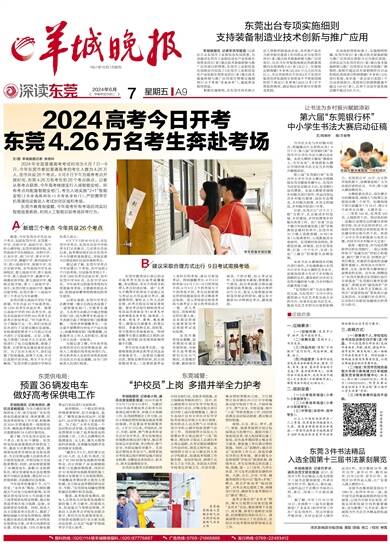 文/图 羊城晚报记者 余晓玲 2024年全国普通高考考试时间为6月7日—9日,今年东莞市参加普通高考的考生人数为4.26万人,全市共设26个考点。6月6日下午为高考考点开放时间,东莞4.26万名考生到26个考点踩点。记者从各考点获悉,今年高考继续实行入场智能安检, 所有考点均配备智能安检门,考生入场实施“2+1”智能安检(2次金属探测仪+1次智能安检门),严防携带手机等通信设备进入考试封闭区域和考场。 东莞市教育局提醒,今年高考所有考场启用实时智能巡查系统,利用人工智能识别考场异常行为。 新增三个考点 今年共设26个考点 据悉,今年东莞全市共设26个考点,包括东莞中学、东莞第一中学、实验中学、高级中学、莞中松山湖学校、东莞外国语学校、东华高级中学东城校区、光明中学、石龙中学、虎门中学、常平中学、万江中学、塘厦中学、第四高级中学、第六高级中学、厚街中学、光正实验学校、东华高级中学生态园校区、第七高级中学、第十高级中学、第八高级中学、麻涌中学、海德双语学校、第五高级中学、翰林实验学校、第十三高级中学。其中,东莞市第五高级中学、翰林实验学校、东莞市第十三高级中学三个考点为今年新增。 东莞市第五高级中学位于高埗镇,今年共设43个标准考场,有1234名考生在此应考。除第五高级中学的780名考生外,还有北辰高级中学的454名考生在该考点参加考试。“作为新考点,为了确保万无一失,我们全校动员并进行了实景实操应急演练,安检通道按要求于5月底已完成并进行了反复演练。公安、交警、电力等部门也给予大力支持,特别进行了电力设施检修,排除了隐患,目前供电设施设备状况良好。为了应对大雨天气,我们设置了防雨通道,如果下大雨,车可以直接开进学校,考生下车不会淋雨。”东莞市第五高级中学相关负责人表示。 6日下午2时40分左右,在东莞中学考点,东莞市长安中学的考生们正在踩点,几名考生告诉记者,高考期间他们住在东莞市中小学德育基地那边,学校安排大巴接送他们往返驻地和考点。 据记者了解,东莞中学考点今年设置51个考场,其中包括2个日语考场,另设备用考场3个,共有1469名考生在此应考,其中东莞中学905名,长安中学564名。今年该考点的备用考场均为常规备用考场,主要提供给出水痘、发烧或咳嗽等特殊情况的考生使用。 记者注意到,东莞中学考点在教学楼一楼左右两边各设置了一道智能安检门,方便考生通过。几名考生在踩点中通过智能安检门时,因为携带手机或电子手表就引起了智能安检门报警提醒。一旁的老师提醒考生,一定注意不要携带任何电子产品在身上;如遇智能安检门报警提醒,应根据考点工作人员的指引,接受工作人员进一步检查。 另据记者了解,今年各考场还将首次实行实时智能巡查,利用人工智能识别考场异常行为,考生和考务人员如有异常系统将自动在后台发出提醒,由专门的核查人员进行核查。 建议采取合理方式出行 9日考试需换考场 东莞市教育局日前已向全市高考考生发出高考温馨提醒,考试期间,考生不得将手机带入考点封闭区域。请广大考生不携带手机等电子设备以及与考试无关用品前往考点,确需携带的,要听从工作人员的安排,在考点指定区域妥善放置。要在考试前仔细检查考试用具是否准备妥当(如黑色字迹的钢笔或签字笔、2B铅笔、三角板、铅笔刀、圆规、橡皮擦等),钢笔应注满墨水,铅笔应削好。多备各种文具,如铅笔、签字笔等应多准备两支。特别提醒考生要注意购买正规的2B铅笔,使用假2B铅笔将影响答题卡扫描。 考生在每天赴考点前,一是要细致检查两证和考试用品是否准备妥当,二是要适当提前出发,预留足够的时间,防止因故耽误考试;三是要按准考证上各科目的考场、座位号参加考试。特别提醒考生:6月9日的考场与6月7日—8日的考场不同,6月9日上午的考场与下午的考场不同,考生应按照规定的时间提前前往考点熟悉考试场地。进入考场前应检查考场与准考证上显示的考场是否一致。进入考场后,须按照指定的位置入座,未在规定的座位就座参加考试将按考试违纪处理。 东莞市教育局还提醒,高考期间可能会有雷阵雨,全体考生高考期间密切关注天气情况,注意做好防御,提前备好雨具、干的衣鞋,防止考试证件、文具被雨水淋湿;要根据天气情况,结合考前踩点情况提前规划赴考路线,采取合理的出行方式,留足入场智能安检和身份验证的时间,建议至少提前60分钟到达考点,避免延误。
