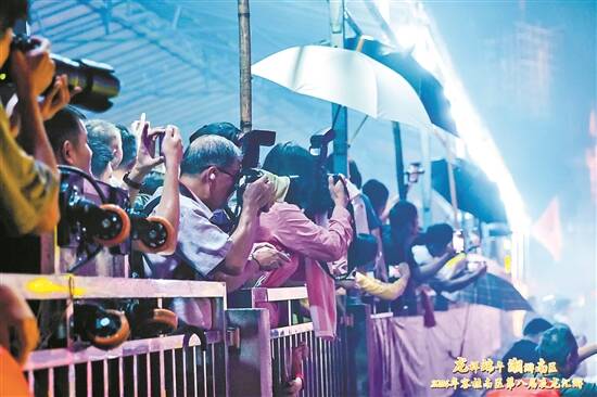 再大的雨也淋不灭市民游客看夜龙的兴致 |