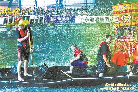 伴随音乐鼓点,船手们上下跃动“摁”动船身 |