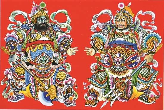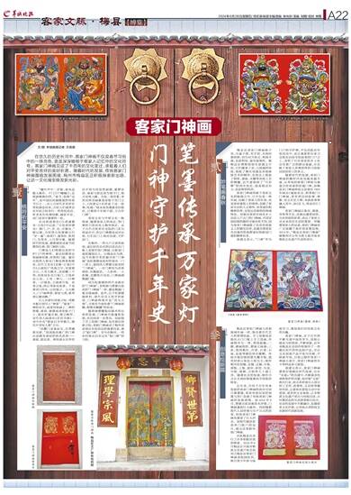 文/图 羊城晚报记者 丘锐妮 在悠久的历史长河中,客家门神画不仅是春节习俗中的一抹亮色,更是深深植根于客家人记忆中的文化符号。客家门神画见证了千百年的文化变迁,承载着人们对平安吉祥的美好祈愿。随着时代的发展,传统客家门神画面临发展困境,梅州市梅县区正积极探索新出路,让这一文化瑰宝焕发新光彩。 桃符祈平安 “爆竹声中一岁除,春风送暖入屠苏。千门万户曈曈日,总把新桃换旧符。”春节,俗称“过年”,是中国民间最隆重的传统节日之一,由上古时代岁首祈岁祭祀演变而来,古时人们通常会在年初之际举行一些祭祀活动,祈求来年风调雨顺、阖家平安。而门是其中重要的一祀。 东汉班固曾在《白虎通德论·五祀》中记述:“五祀者何谓也?谓门、户、井、灶、中溜也。”据记载,当时祭五祀要顺五行“岁一遍”:春祭户、夏祭灶、秋祭门、冬祭井、六月祭中溜。随着时代的发展,渐渐演变成春节时期祭灶神、祭门神的习俗。 门神是人们构想出来的守护门户的神明。秦汉时期曾出现画着祥禽、祥兽的门画。最早出现的人格化门神是神荼和郁垒,汉代王充在《论衡·订鬼》中引《山海经》“沧海之中,有度朔之山,上有大桃木,其屈蟠三千里,其枝间东北曰鬼门,万鬼所出入也。上有二神人,一曰神荼,一曰郁垒,主阅领万鬼。恶害之鬼,执以苇索而食虎。于是黄帝乃作礼,以时驱之。立大桃人,门户画神荼、郁垒与虎,悬苇索以御凶魅。” 古人在辞旧迎新之际,用桃木板分别写上“神荼”、“郁垒”二神的名字,或者用纸画上二神的图像,悬挂、嵌缀或者张贴于门上,意在祈福灭祸,谓之桃符。宋代诗人陆游在《岁首书事》一诗中亦有“郁垒自书夸腕力,屠苏不至叹人情”之句。 “抖擞门丞秦叔宝,贝带璘斑光射。”我国流传最广的门神应是隋末唐初的两名武将——秦琼、尉迟恭。相传唐太宗李世民不知为何忽然病倒、噩梦连连,秦琼与尉迟恭为他守门,他才安然入睡。为免二将劳累,李世民将其画像真容贴于宫门之上。《西游记》也讲述了这一故事,叹道:“他本是英雄豪杰旧勋臣,只落得千年称户尉,万古作门神”。 客家文化与中原文化一脉相承,随着客家人的南迁,祭门神的习俗也传入梅州地区。由于古代百姓所住宅院的门多为两扇对开,所以门神都是成对出现,它们在门上相对而视,守护家门。 在梅州,一些大户之家的祖祠,或旧时有功名的民居会在门板上直接手绘门神画,以彰显门庭和激励后人。以梅县区为例,迄今有据可考的最早的“门神画”是松源镇金星村的南宋一门三进士、爱国诗人蔡蒙吉故居的“门神画”。一对门神均为武将装扮,长髯威武,一人扶剑、一人扶锏,双脚张开而站,门神画满整副门板。 同为松源镇的明代龙源宫的“门神画”,其构图与蔡蒙吉故居的“门神画”一样,都是整副门板全部画满。此外,位于松源镇圆岭村、清代官员王利亨的故居,门神画构图亦是“顶天立地”,当地至今流传着“门神画到脚,照壁有麒麟”的俗语。 随着唐朝雕版印刷术的出现和发展,门神画开始蓬勃发展,在民间进一步普及。因此除了手工绘制门神画,每年辞旧迎新之际,张贴门神画成了梅州客家地区年俗活动的重要内容,谓之“贴门神”。至今在梅州,一些农村地区仍有过年“贴门神”的习俗。 妙笔画春秋 梅县区客家门神画始于宋,兴盛于清,有手绘、木刻印制两种,均为对开形式,构图丰满,色彩明快,富有装饰性。据梅县区博物馆馆长徐建文介绍,它们继承了宋、元绘画的传统,吸收了舞台戏剧及其他姊妹艺术的精华,在技法上吸取了剪纸、漆画、木雕等传统工艺的精髓,近代更吸纳了“月份牌”的西洋技法,线条简洁有力,色彩鲜明热烈。 客家门神画深嵌于客家文化的脉络之中,它不仅是一种年画,反映了客家人的年俗,也是客家建筑上的装饰,反映了客家先民的人文情怀、审美意识和精神世界,呈现出其独特的地域特色。绘制在客家宗祠及乡土民居入户大门的门神画,不同宗祠绘制的题材可能有所不同,因为客家门神画除了具有传统意义上的镇宅功用,还蕴含着客家先民强烈的族群意识和彰显门庭的精神诉求。 徐建文表示,“门神”作为门户的守护神,不仅活跃在年俗活动中,还以强韧的生命力呈现在民间寺院庙观的门户之上,表明了它在客家的乡土社会有着广泛的群众基础,亦反映了客家人多神崇拜的习俗和民间信仰上的多元。 随着时代的发展,客家门神画的题材内容也越来越丰富,从单纯的辟邪门神转为寓意吉祥如意的祈福门神,如梅县区门神画师侯文发曾在1994年画出《福禄双全、财喜临门》门神画,甚至将民间故事、神像、戏文历史人物、戏曲故事等融入其中,如《岳飞、郑成功》门神画。 客家门神画以象征、寓意、夸张等手法,反映出避邪迎祥、吉庆祥和的祈希,表达了客家人对未来美好生活的愿景。伴随着客家人的足迹,客家门神画也广泛流播于海外客家聚居地。2014年,“梅县区客家门神画”被梅州市公布为第五批市级非物质文化遗产代表性项目。 创意绘新篇 梅县区客家门神画与其他地域年画一样,饱含着历代艺人的智慧结晶。手工绘制是直接在大门门板上手工绘画,作画程序为一黑,黑线起稿;二擦,擦画指阴,增强立体感;三彩,指用桃红、丹黄、石青、石绿、品蓝等颜色穿衣戴帽。传统木版印制则要先雕木版,使用材质以染色土纸为主