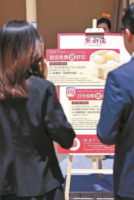 Steamed Red Rice Rolls with Shrimp(金莎红米肠)、Signature Shrimp Dumplings(招牌虾饺皇)……记者从点都德方面获悉,该品牌在广州、佛山的所有门店,均配备中英文“点心纸”,每一款点心都配有产品图以及中英文菜名。“为了让外国客商能快速读懂菜单以及方便点餐,我们特别设计了这份新菜单。”点都德方面说,虾饺在国外的知名度最高,点都德由此准备了“福利”,在4月15日至5月5日期间,持广交会参展商证件或官方工作证件的人士,前往点都德广州、佛山区域任一门店,都可以免费获得1份“招牌虾饺皇”。