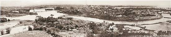 1930年俯拍的惠州府城全景。此城独特的地理形势和优美的自然风光清晰可见:两江环绕东北,五湖连缀西南,城墙临水壁立,湖堤蜿蜒曲折 翻拍自《惠州近代历史图录》 |