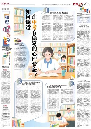 主持/羊城晚报记者 何宁 本期特邀专家/郑清年 周梅 张润林 一周热话题 还有十天就要中考了,这是孩子们人生中首次面临的重大考试。十五六岁的少年正处在生