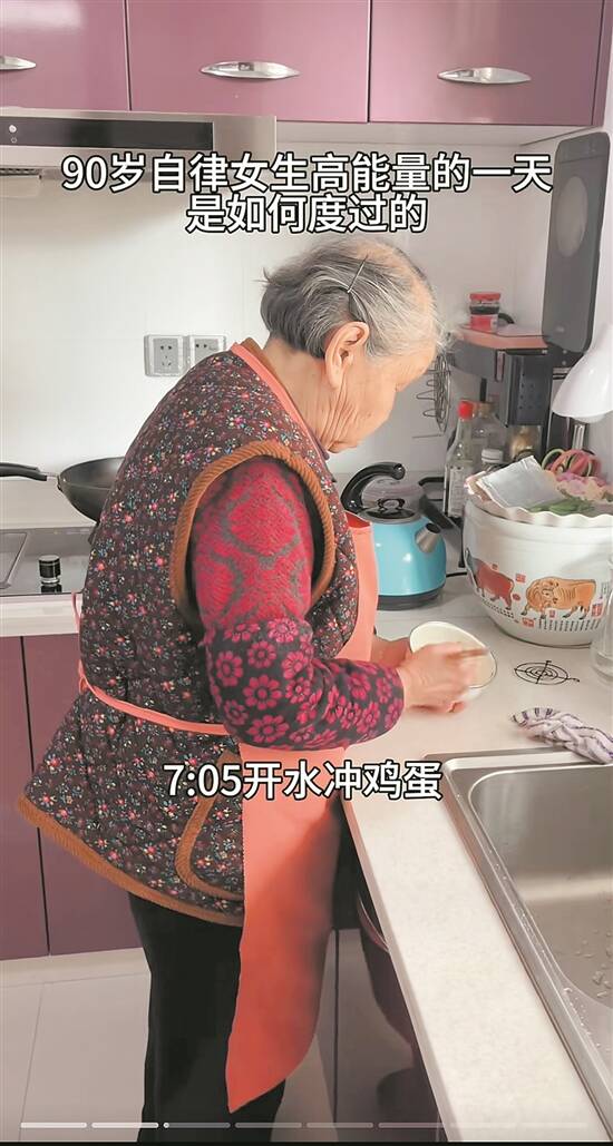 “90岁自律女生高能量的一天是如何度过的?”清晨起床煮早餐、磨豆浆,深夜凌晨仍发面蒸馒头、腌酸菜,或是外出投喂流浪猫。从早忙到晚持续超17小时,不仅能手脚麻利地完成砍芋头、手洗厚被、水缸接水等重活,还精通榨汁机、电磁炉等家电操作。