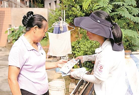 工作人员向居民发放防控手册 |