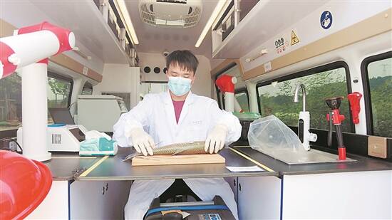 工作人员现场进行鱼体检测 |