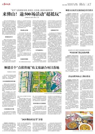 羊城晚报记者 黄松炜 通讯员 王雪 2025年国庆中秋黄金周临近。9月中旬起,佛山市文化广电旅游体育局以“嚟佛山,实抵玩”为主题,发动全市文旅体企业精心安排超500项文旅体活动,用优惠福利诠释“抵”文化,传递“来佛山享超值文旅体验”的诚挚邀约。 围绕该主题,佛山市文化广电旅游体育局推出“嚟佛山超抵玩”“嚟佛山超抵食”“嚟佛山超抵睇”“嚟佛山超抵叹”“嚟佛山超抵买”5大板块,从景区优惠到美食折扣,从演出套票到购物满减,福利多、覆盖广,让本地市民和各地游客在这个双节切实享受到佛山文旅的“抵”值诚意。 新潮活动尽兴 顺峰山公园举办的佛山市茶咖文化周,汇聚超120家咖啡品牌,设“顺德智造”专区及年度优享区,推限时最低价咖啡机;引入顶尖咖啡赛事,联动顺峰山公园,白天可旅拍、泛舟品咖啡,夜间有灯光秀,打造沉浸式体验。 三水南山镇浮日蓝矿咖啡作为“文旅+咖啡+自然景观”新业态代表,创新打造“日照金山”美景与咖啡品鉴结合的独特体验,解锁休闲度假新方式。 对于爱好新鲜体验的游客,佛山DiveHub国际潜水乐园提供专业潜水场地与服务,满足探索水下世界的好奇心;酷贝e族宠物文化产业基地的“带着宠物来旅行”,让游客与爱宠共享假期。潭洲国际会展中心将成为潮流聚集地,2025佛山CPE宠物嘉年华汇聚宠物品牌,开展大赛、领养等活动,宠物主人可带爱宠社交互动。 此外,2025千灯湖Cosplay潮玩节设4大赛事,供年轻人社交展风采;2025痛一会二次元痛车文化展、佛山松果动漫游戏嘉年华,为二次元与动漫迷打造专属狂欢;2025佛山潭洲汽车工业展览会·秋季,为汽车爱好者提供一站式选车服务;高明区蘇村锦鲤文化街区推出8天不重样主题活动,让游客沉浸式感受蘇村IP文化。 寻味佛山珍馐 作为“世界美食之都”,佛山正为游客准备味蕾盛宴。顺德欢乐海岸PLUS举办的“世界美食之都顺德美食文化嘉年华”,汇聚本土与全球风味,搭配潮流演出,游客可一站式尝遍美味,在味蕾满足中感受热闹氛围。陈村花卉世界开展的“2025粤港澳大湾区(顺德)美食文化周”,设5大主题展区,让游客轻松吃遍粤式名点与全球美食。 两大美食盛会之外,更多特色主题活动不容错过。“2025顺德啤酒美食文化节”在北滘举办,以啤酒和音乐为核心打造沉浸式狂欢;“武韵樵山·味动中华”2025西樵岭南美食文化周在听音湖区域开展,将美食、音乐与民俗表演相融合;高明牛街将举办“超集牛市”,可品尝“会跳舞的牛肉”,与牛里牛气的打卡点拍个照。 三水三农产品链接会汇聚7个镇街名优土特产,不仅能现场大快朵颐,还能轻松带地道美味回家,留存佛山味道记忆。 非遗视听震撼 佛山市博物馆新馆即将开馆迎客,同步开启5大展览,全面呈现佛山千年文脉与本土特色。岭南新天地将举办“新焺游园烟火岭南”活动,携手艺术家打造5大文化体验,光影装置与市集相映成趣,让游客在逛玩中感受岭南文化魅力。 非遗体验方面,广东千古情景区开展“火人狂欢节”,更推出门票优惠,游客可欣赏震撼演出。粤韵清晖历史文化核心区举办大良鱼灯会,组织超300人巡游队伍。三水区白坭镇、狮山镇上柏社区等地开展烧番塔民俗活动,市民可在祈福与游园等传统仪式中感受节日氛围。 体育赛事同样精彩。2025年佛山市第二届F3龙舟超级联赛总决赛将于10月2日在西樵听音湖举行,作为佛山自主打造的龙舟品牌赛事,展现佛山人民团结协作、奋勇争先的龙舟精神,让现场观众沉浸式感受龙舟竞渡的速度与激情。 此外,2025黄飞鸿杯全国民族民间龙狮公开赛、2025南海龙超总决赛暨纳德利龙舟联赛总决赛将陆续开展,环两江先行区(龙江)水上活动嘉年华、南庄“车水马龙”节也将带来龙舟赛、桨板球公开赛等赛事,呈现多元体育盛宴。 文艺盛宴润心 “双节”期间,佛山将有多场文艺表演,兼顾传统与潮流。佛山祖庙博物馆推出粤剧演出,节日期间每日开展折子戏专场。2025湾区非遗潮玩节在潭洲国际会展中心举办,集非遗展示、表演与市集于一体,游客还可参与体验项目,感受非遗创新魅力。 多元音乐活动备受期待。2025泡泡岛音乐与艺术节·大湾区站将在佛山大草地音乐秀场举行;林忆莲《回响Resonance》2025巡回演唱会、2025黄品源TASTE巡回音乐会,以及GO WITH THE FLOW林峯演唱会等将走进佛山开唱。此外,2025佛山MusicBlend跨界音乐嘉年华汇聚多元音乐风格,将为游客带来新鲜听觉享受。 优惠福利不停 据了解,佛山在“双节”期间推出多项优惠福利,覆盖游玩、出行、购物等多个场景,各种券包优惠累计超千万元。 顺德区推出顺德旅游美食一卡通,一卡畅玩13个收费景区,享受美食优惠折扣。禅城区发放“碰一碰”3000万文旅消费优惠券,同时联合高德地图推出500万打车补贴,游客在高德地图App搜“禅城漫游路线”即可参与。紫南村推出“一票畅玩”优惠;南海影视城推出早鸟票及“一票畅玩两日”福利,同步开展“全民飙戏・影城夺宝”活动。 购物场景的优惠丰富。2025桂城湾区第三届带“电”爱车节聚焦年轻、家庭、高端消费人群,展现桂城旺盛的商业活力与强大的消费潜力。佛罗伦萨小镇举办十周年庆典,以“鱼灯”为核心载体打造灯光节,推出消费抽奖、赠礼及抖音团购券活动,游客单笔消费满2888元即可获赠小镇十周年限定礼盒。2025年“十一”西樵牛仔生活节汇聚多家西樵纺织企