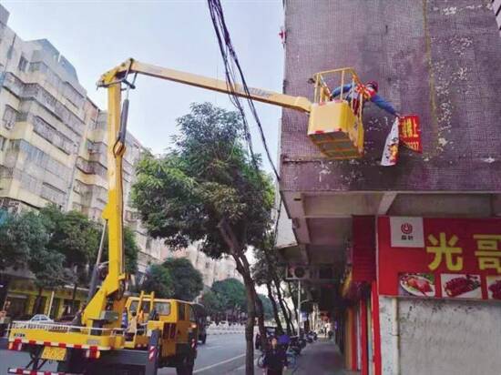 这种高空“牛皮癣”还给城市管理带来了新挑战。“墙身贴字一般散布在墙体的不同位置,而且张贴在一定高度上,清理难度相当大。”该负责人向城Sir介绍,“为了铲除这些小广告,城管执法人员需要出动吊机、云梯甚至蜘蛛人,处理难度和工作量都倍增,可以说是冒着生命危险来清理这些高空‘牛皮癣’。”