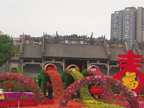 陈家祠堂前的“花景”依然能让人感受到春节“余味”,赫然醒目的大红“春”,六条“时光隧道”如瀑布般倾泻出花河,汇聚成一片花海,彰显出蓬勃生机,吸引着路人驻足观赏。