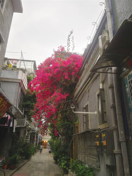 古朴幽静小巷,倾泻而下的勒杜鹃形成一道天然垂帘。
