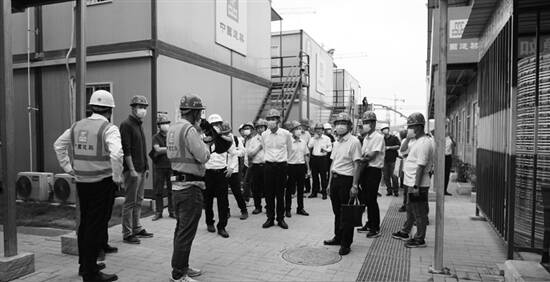 在项目施工现场,观摩团了解了项目施工进展,并参观了项目硬件设施以及VR安全体验室,听取了项目管理人员对高处作业一条生命线、中建八局安全三张网、危大工程管控方法等安全管控标准做法的讲解。观摩团还参观了项目承建单位中建八局一公司建立的“工友村”。“工友村”内设有工友超市、理发市、医务室、工友夜校、工友夫妻间等多种设施,700多名工人居住其中。